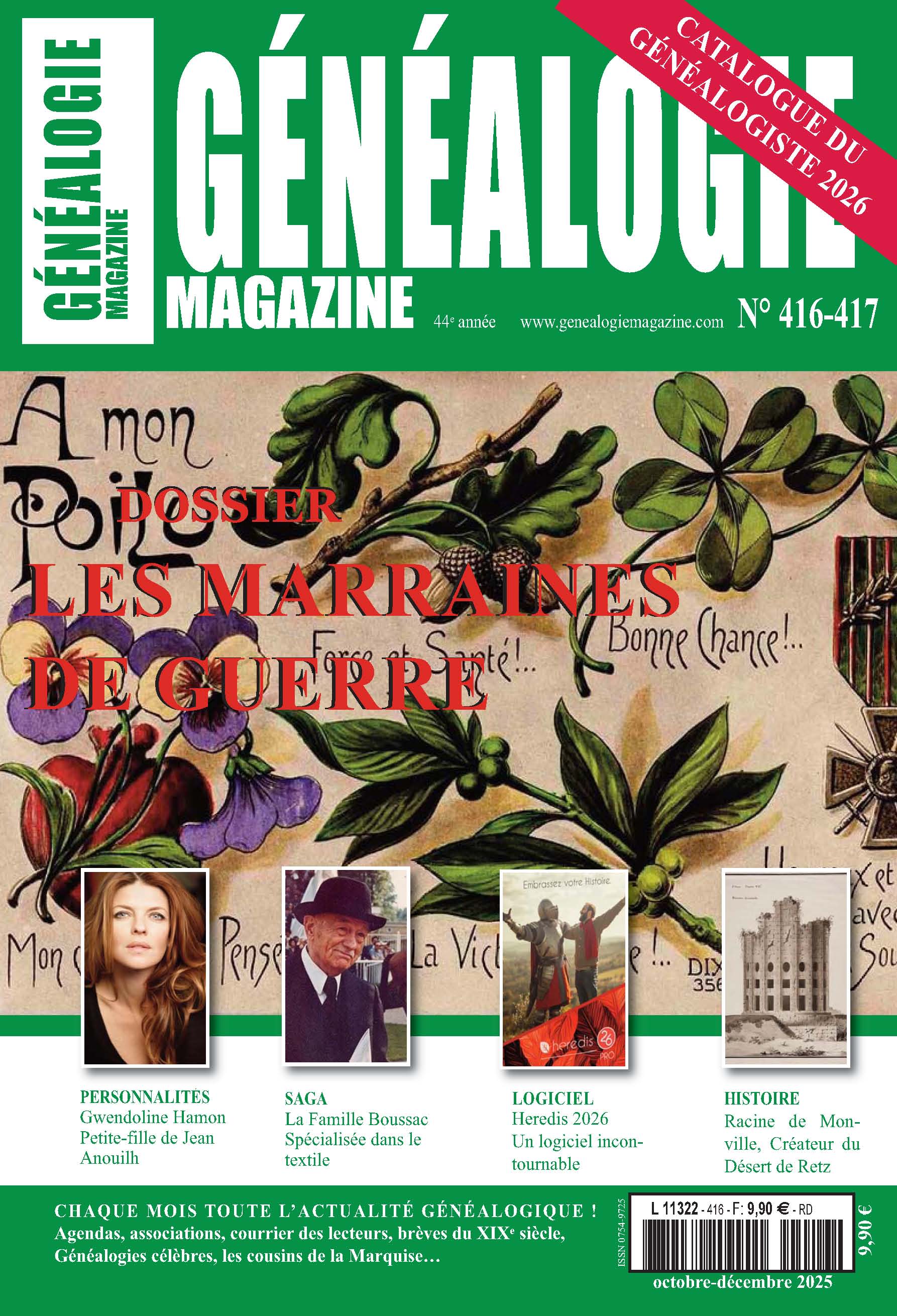 Dossier Les marraines de guerre, Personnalités Gwendoline Hamon, Hommage Personnalités Robert Redford, Claudia Cardinale, Actualités politique Sébastien Lecornu, Il y a cent ans Le centenaire d’Alain Decaux (1925-2016) Histoire La Parenté entre Racine de Monville créateur du désert de Retz et le dramaturge Jean Racine, Brèves du XIX siècle Les «Optants» d’Alsace-Lorraine, Logiciel Heredis 2026, Saga La famille Boussac