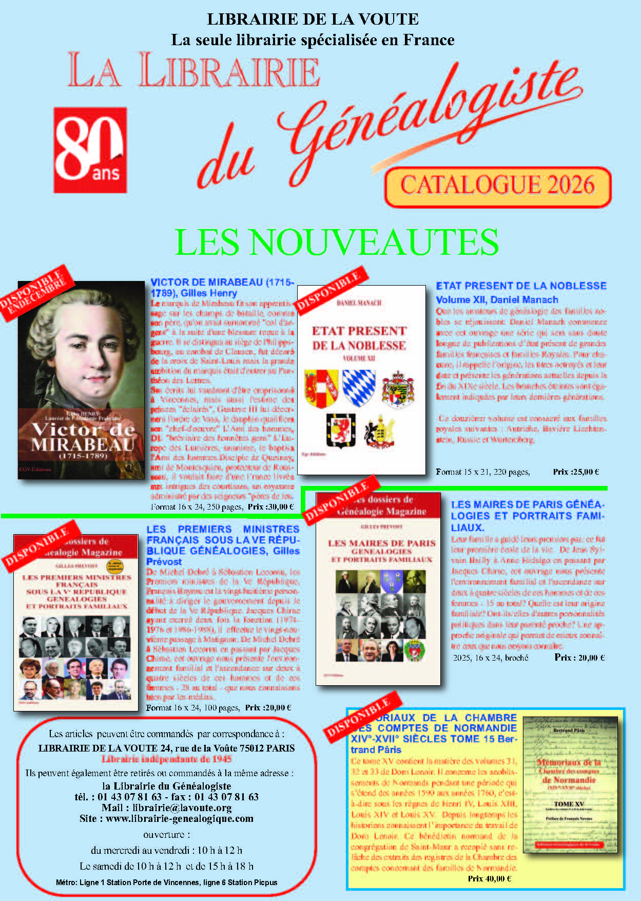 Suite à la fusion des deux librairies, la librairie de la Voûte offre dorénavant les mêmes services que la librairie du généalogiste. Ainsi, vous pouvez retrouver tous les anciens numéros Généalogie-Magazine, les livres de généalogie, renouvelez votre abonnement et pleins d’autres choses…
